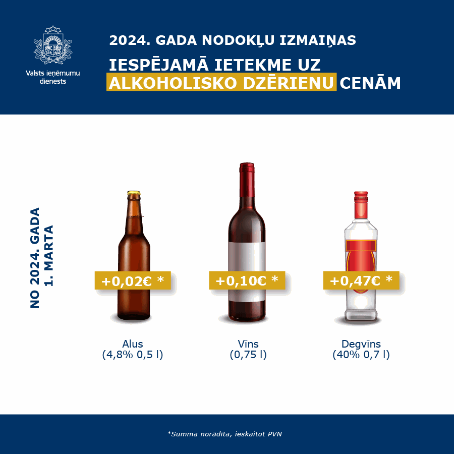 1 марта 2024 года меняется также ставка акцизного налога на безалкогольные напитки с содержанием сахара от 8 граммов (включительно) на 100 миллилитров и энергетические напитки, в результате чего цена этих товаров может возрасти на 0,04 EUR за один литр напитка (включая НДС).